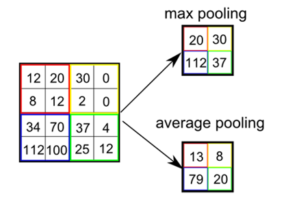 위 그림을 간략히 정리하자면 Max Pooling 에서의 20(좌측 상단, 붉은색)은 입력 이미지의 좌측 상단(2x2) 붉은색 픽셀 중 가장 큰 값이며, Average Pooling 에서의 13(좌측 상단, 붉은색)은 입력 이미지 붉은색 범위의 평균값이다.