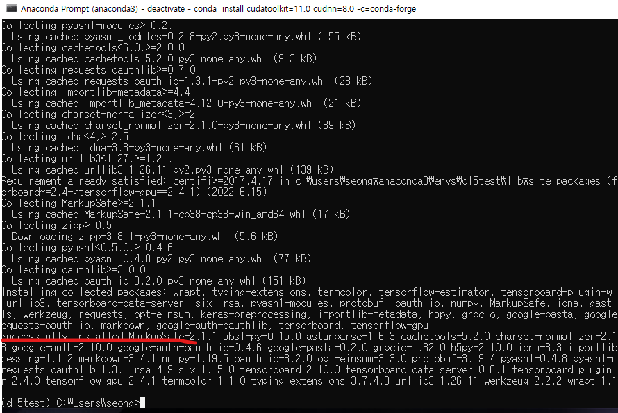 - 툴킷 설치 : conda install cudatoolkit=11.0 cudnn=8.0 -c=conda-forge